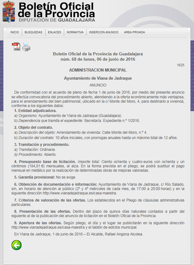 En el Boletín Oficial de la Provincia del lunes 6 de junio de 2016, se publica el Anuncio por el que este Ayuntamiento convoca por procedimiento abierto a la oferta más ventajosa, el arrendamiento de la Casa de la Maestra, para destinarla a vivienda.