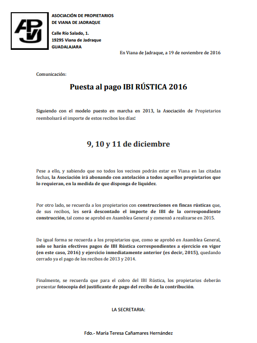 Siguiendo con el modelo de 2013, la Asociación de Propietarios de Viana de Jadraque reembolsará los recibos del IBI de Rústica los días 9, 10 y 11 de diciembre.