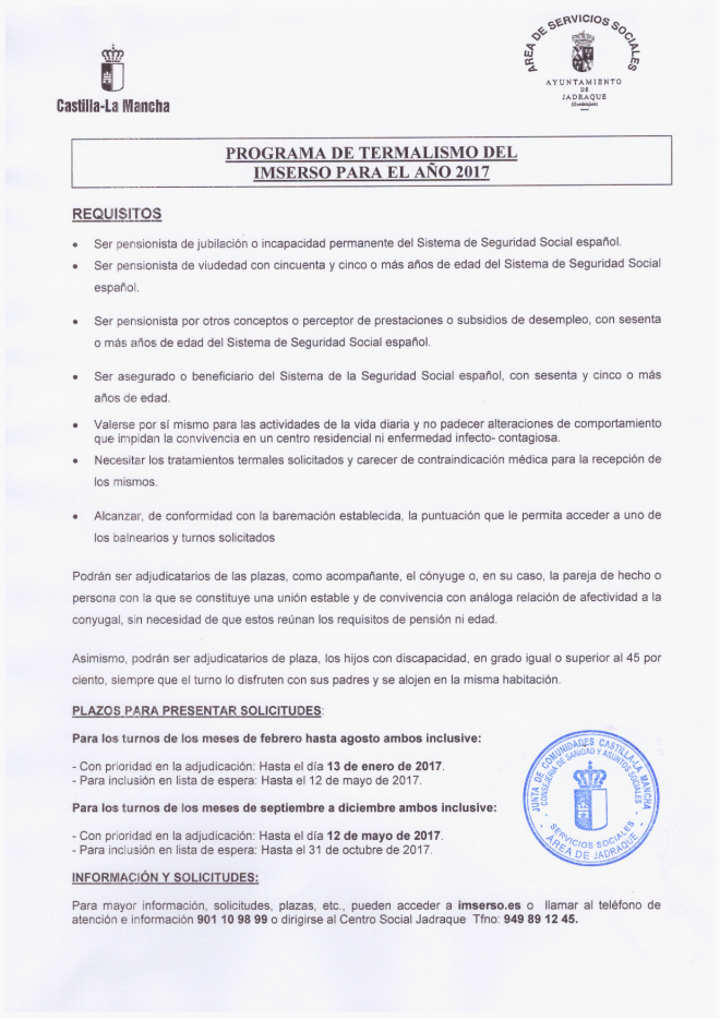 Desde el Área de Servicios Sociales de Jadraque piden que difundamos la información sobre los programas de Termalismo del IMSERSO para el año 2017.
