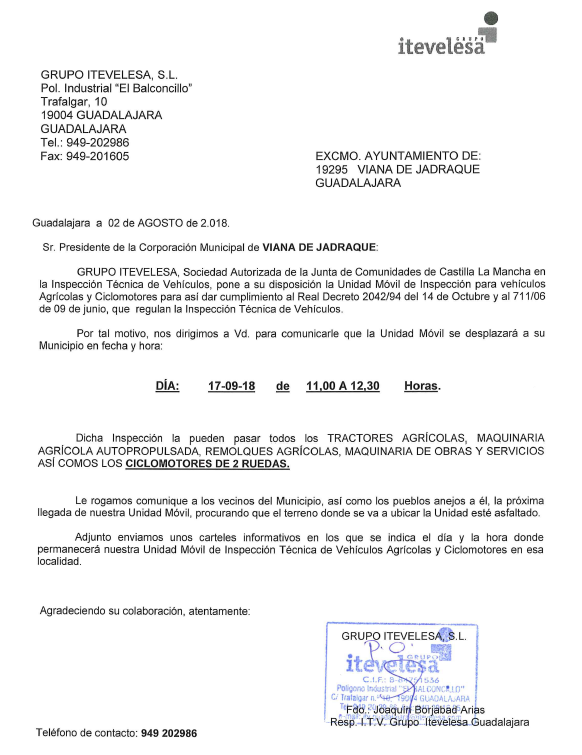 El próximo día 17 de septiembre de 2018, lunes, de 11:00 a 12:30, la Unidad Móvil de inspección móvil para vehículos Agrícolas y Ciclomotores se desplaza a Viana de Jadraque.