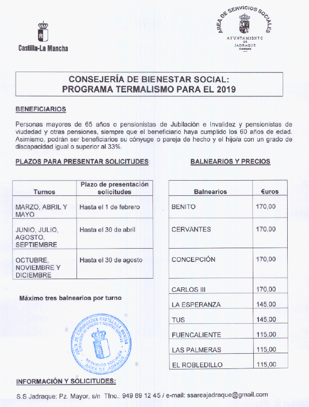 Desde el Área de Servicios Sociales de Jadraque nos hacen llegar la información y requisitos del Programa de Termalismo IMSERSO 2019 y Termalismo 2019 de la Consejería de Bienestar Social.