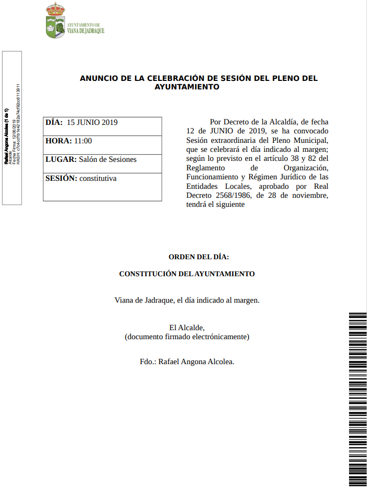 El Próximo Sábado 15 de junio, a las 11:00 de la mañana, se convoca Sesión Extraordinaria del Pleno Municipal con el único punto del Orden del día: CONSTITUCIÓN DEL AYUNTAMIENTO.