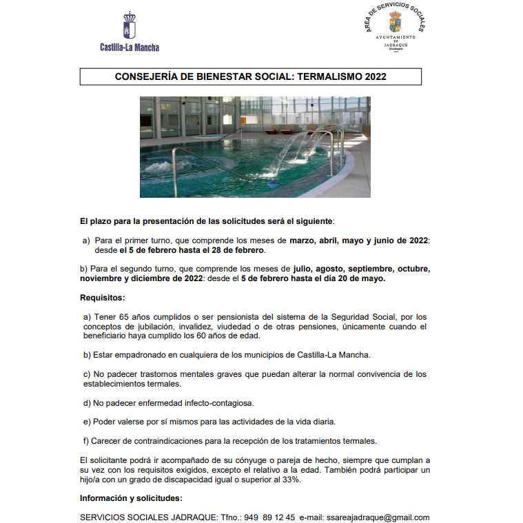 Desde el Área de Servicios Sociales de Jadraque piden la difusión de la información del programa de Termalismo para 2022 de la Consejería de Bienestar Social de la Junta de Comunidades de Castilla-la Mancha.