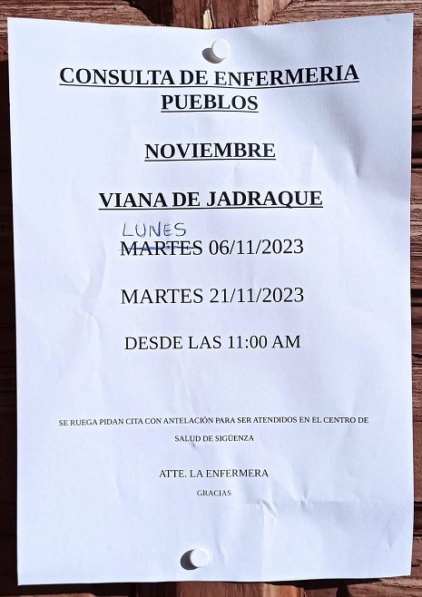 En el día de ayer, la enfermera que vino al Consultorio Local de Viana de Jadraque a pasar consulta, dejó un cartel en la puerta en el que indicaba que las próximas citas de enfermería serán los próximos días: