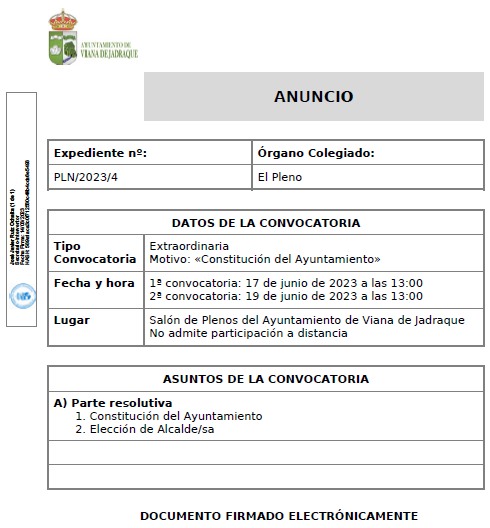 El próximo sábado 17 de junio, a las 13:00 horas, en el Salón de Plenos del Ayuntamiento de Viana de Jadraque, se constituirá el Ayuntamiento de Viana de Jadraque, tras las elecciones del pasado 28 de mayo.