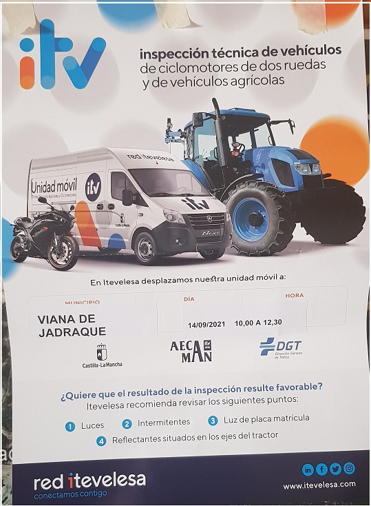 El próximo día 14 de septiembre de 2021, de 10:00 a 12:30 horas, se desplaza otro año más la Unidad Móvil para vehículos Agrícolas y Ciclomotores.