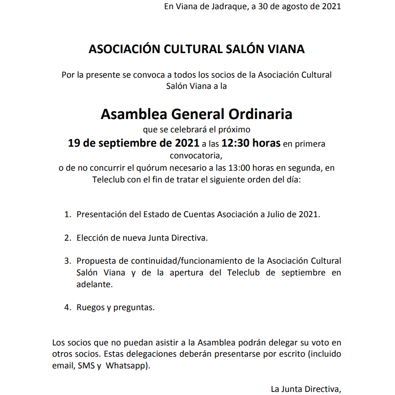 El Próximo domingo 19 de septiembre a las 12:30 horas, la Asociación Cultural Salón Viana (el Tele-Club) convoca a reunión a sus socios.
