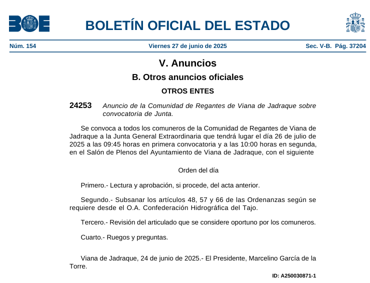 En el Boletín Oficial del Estado del viernes 27 de junio se publica el Anuncio de la Comunidad de Regantes de Viana de Jadraque sobre convocatoria de la Junta, a las 09:45 horas en primera convocatoria y a las 10:00 en segunda.
