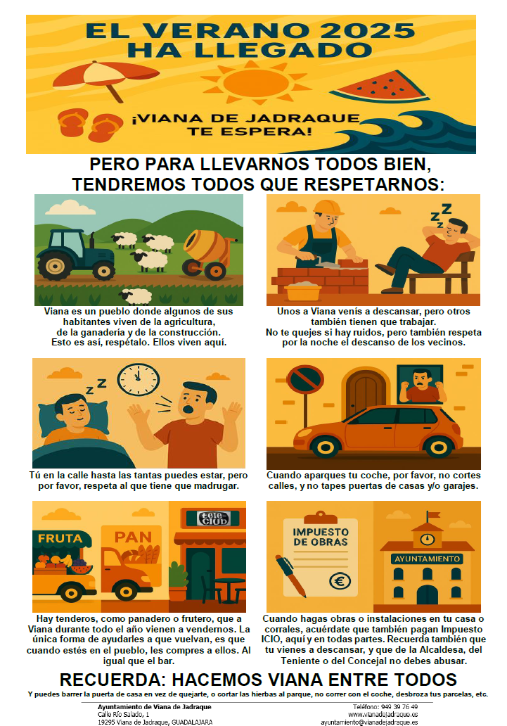 Viana de Jadraque celebra la llegada del verano con un cartel vibrante 🌅, invitando a vecinos y visitantes a disfrutar de la temporada estival en un entorno único. Bajo el lema "El verano 2025 ya está aquí. ¡Y Viana de Jadraque te espera! 🎉", el diseño destaca elementos emblemáticos del pueblo y transmite un mensaje de convivencia y respeto 🙌, con ilustraciones que representan la vida y economía local 🚜🍞🍹.