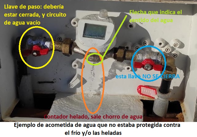 En la red de abastecimiento de agua no se ha sufrido ningún daño, pero en las últimas semanas sí que se ha podido comprobar como de varias acometidas de viviendas y/o inmuebles salía agua al exterior, acometidas que no estaban protegidas al frío, o que estando el inmueble vacío, no estaba cortado el suministro de agua (o estaba mal cortado).