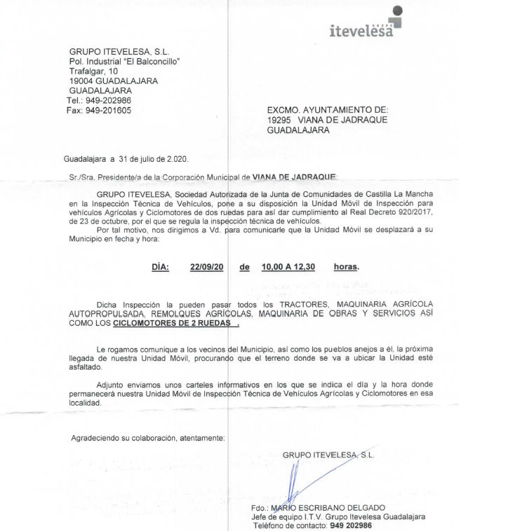 El próximo día 22 de septiembre de 2020, de 10:00 a 12:30 horas, se desplaza otro año más la Unidad Móvil para vehículos Agrícolas y Ciclomotores.