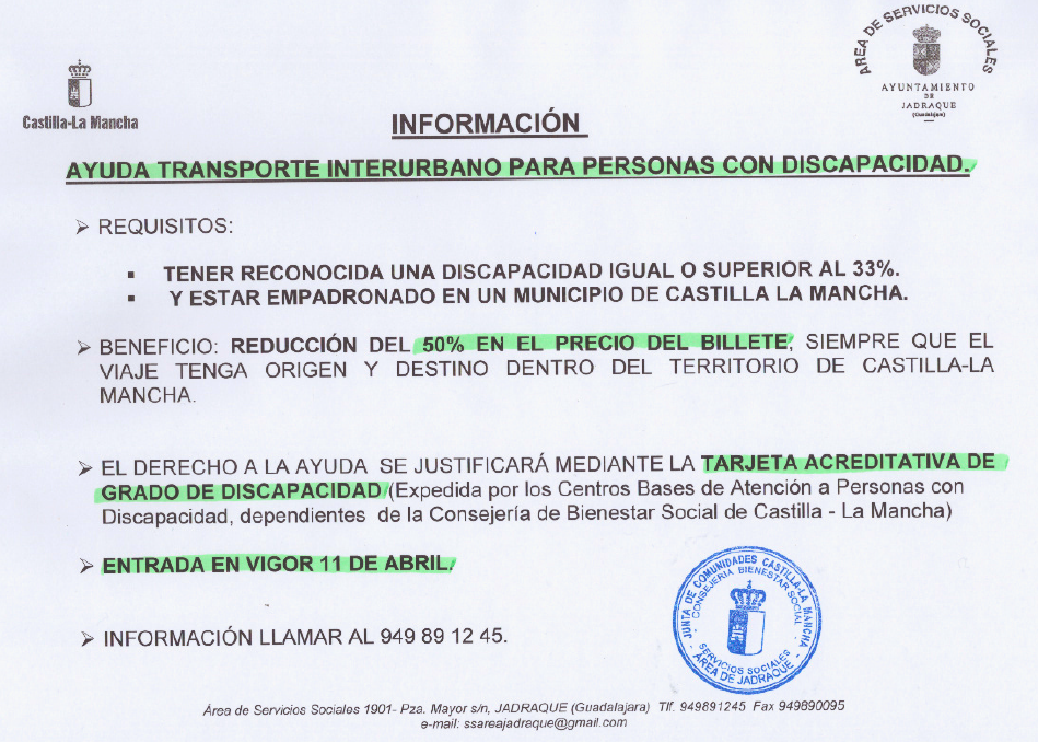 Desde el Área de Servicios Sociales nos envían este cartel con información sobre ayuda al transporte interurbano para personas con discapacidad reconocida igual o superior al 33%.