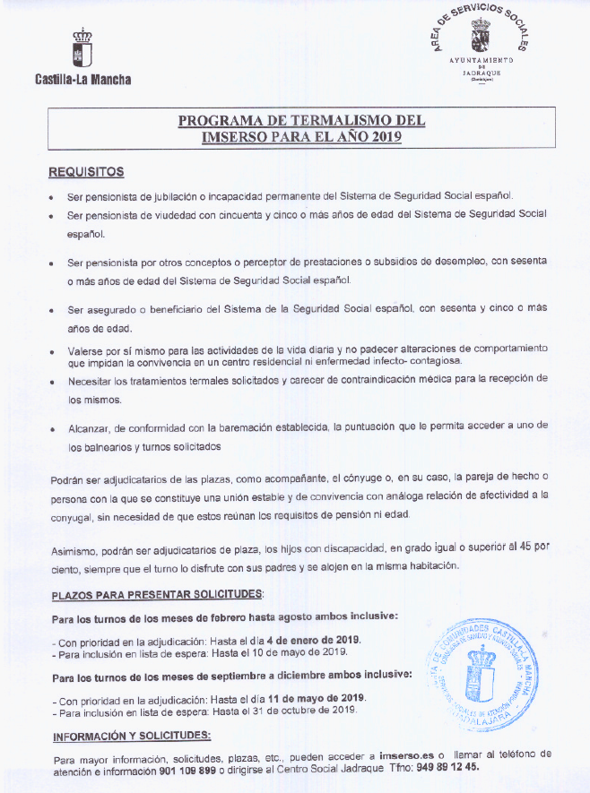 Desde el Área de Servicios Sociales de Jadraque nos hacen llegar la información y requisitos del Programa de Termalismo IMSERSO 2019 y Termalismo 2019 de la Consejería de Bienestar Social.