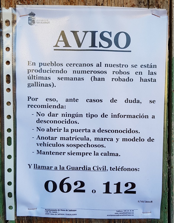 El pueblos cercanos al nuestro se están produciendo numerosos robos, y por eso debemos estar TODOS en alerta. En el pueblo, el día 1 de diciembre, en los lugares de costumbre se colgaron estos carteles, con el fin de avisar y disuadir: