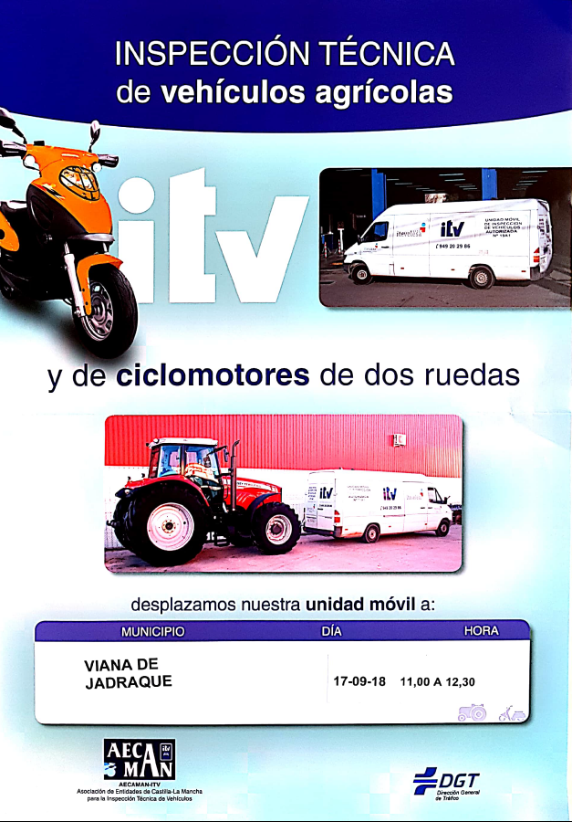 El próximo día 17 de septiembre de 2018, lunes, de 11:00 a 12:30, la Unidad Móvil de inspección móvil para vehículos Agrícolas y Ciclomotores se desplaza a Viana de Jadraque.