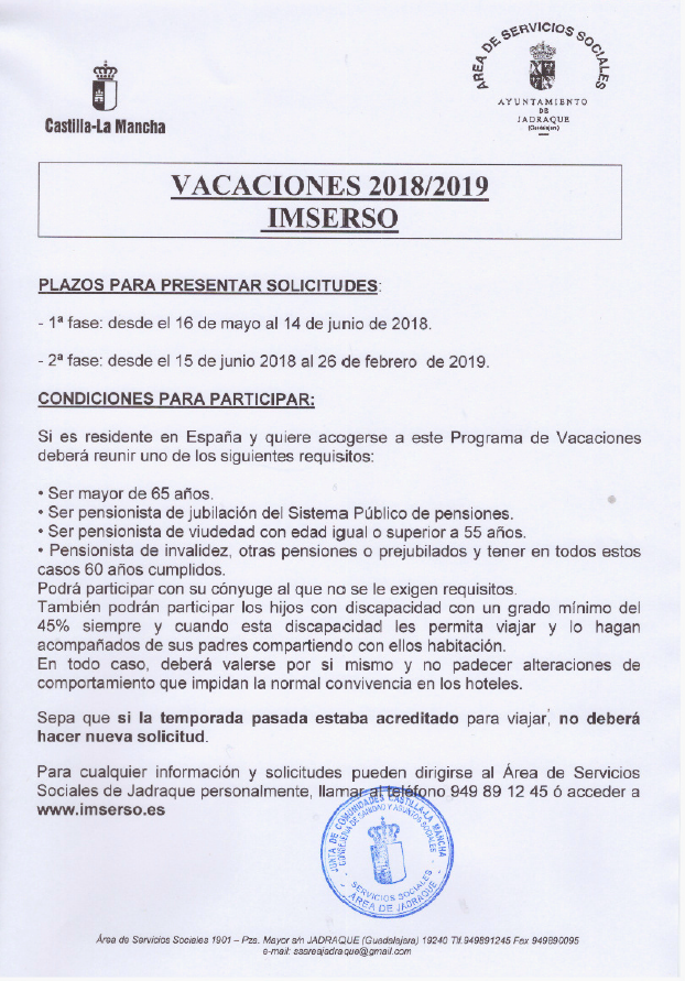 Desde el Área de Servicios Sociales de Jadraque nos piden difusión de la información del Programa de Turismo del IMSERSO.