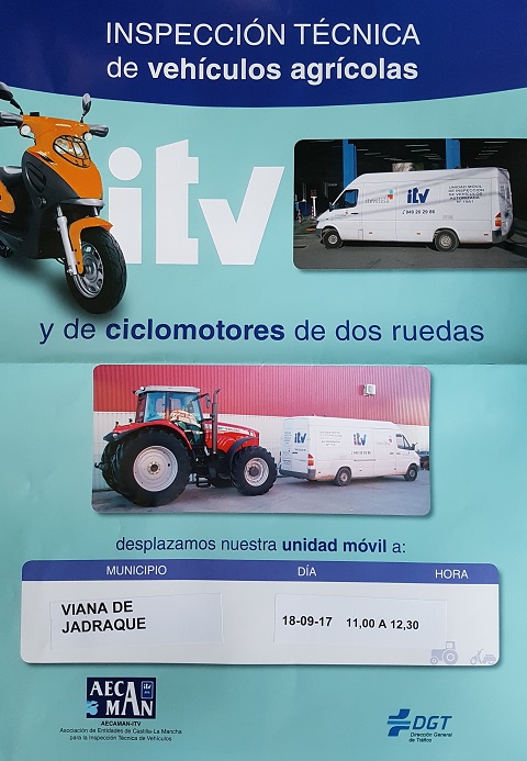 El próximo día 18 de septiembre de 2017, miércoles, de 11:00 a 12:30, la Unidad Móvil de inspección móvil para vehículos Agrícolas y Ciclomotores se desplaza a Viana de Jadraque.