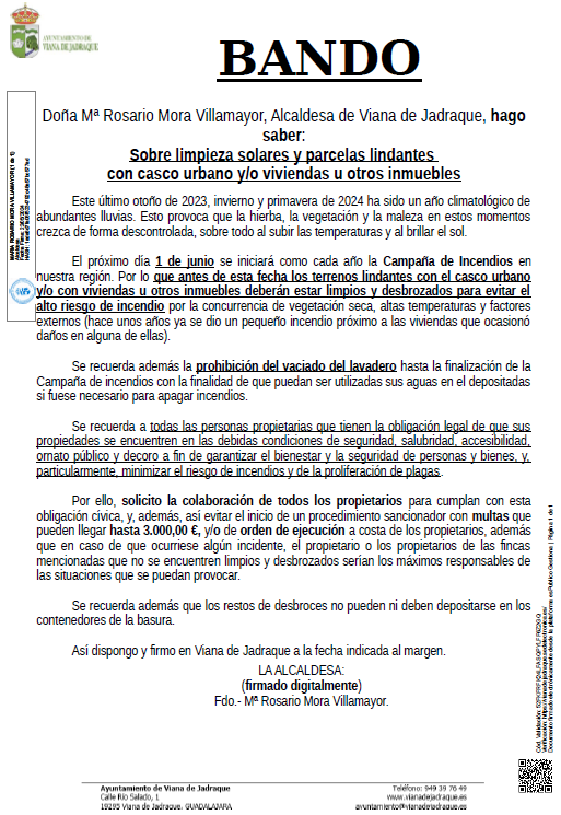 Recuerda que el próximo 1 de junio, en nuestra comunidad autónoma se inicia la Campaña Regional de Incendios, por lo que tanto en el Tablón de Anuncios de la Sede Electrónica de este Ayuntamiento, como en el Tablón de Anuncios del Ayuntamiento, redes sociales, APP Viana de Jadraque Informa y en los puntos de costumbre, se ha publicado Bando sobre limpieza de solares y parcelas lindantes con casco urbano y/o viviendas u otros inmuebles.