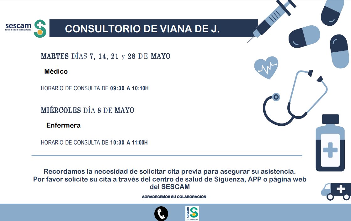 Según nos informan desde el Área Básica de Salud de Sigüenza, las citas en el mes de abril en el Consultorio Local de Viana de Jadraque están previstas los días:
