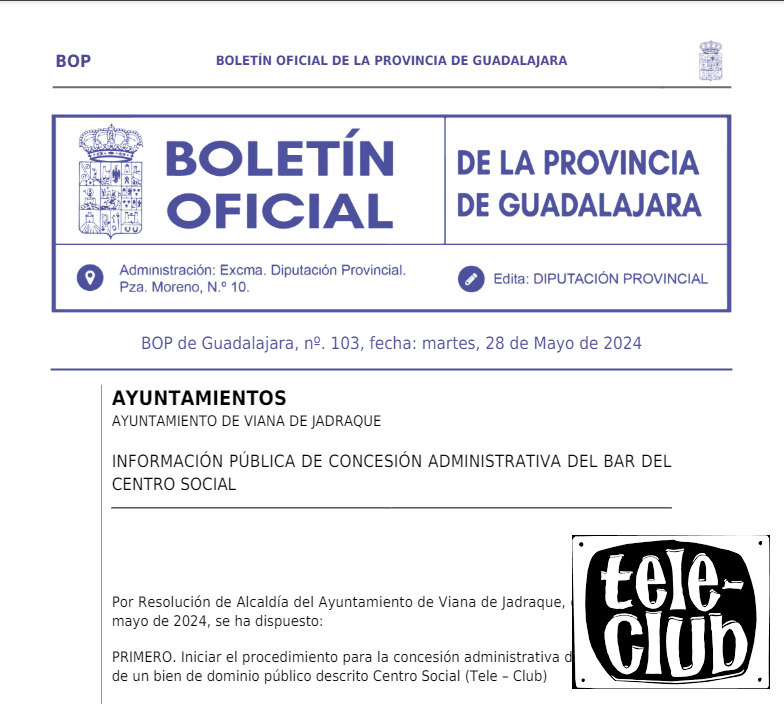En el Boletín de la Provincia de hoy, martes 28 de mayo de 2024, se ha publicado anuncio de INFORMACIÓN PÚBLICA DE CONCESIÓN ADMINISTRATIVA DEL BAR DEL CENTRO SOCIAL para iniciar el procedimiento para la concesión administrativa de uso privativo de un bien de dominio público descrito Centro Social (Tele–Club).