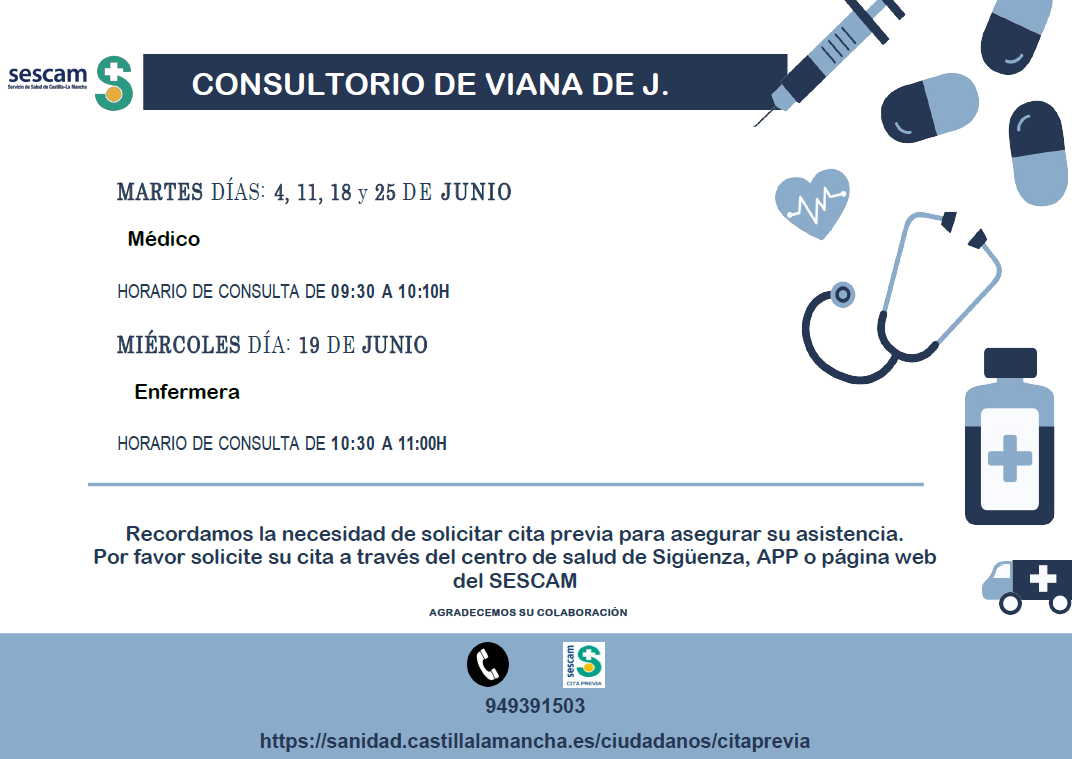 Según nos informan desde el Área Básica de Salud de Sigüenza, las citas en el mes de junio en el Consultorio Local de Viana de Jadraque están previstas los días: