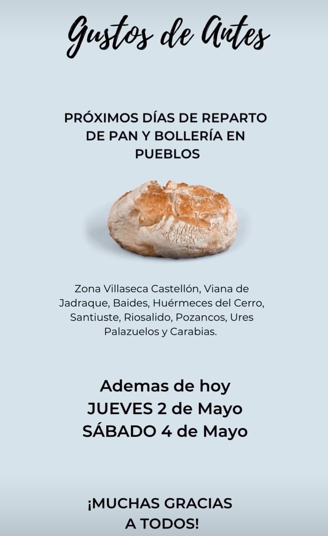 Según nos informan desde Gustos de Antes - Churrería Irene, en este "Puente de Mayo", la venta de pan y bollería en Viana de Jadraque y en el resto de pueblos se realiza: