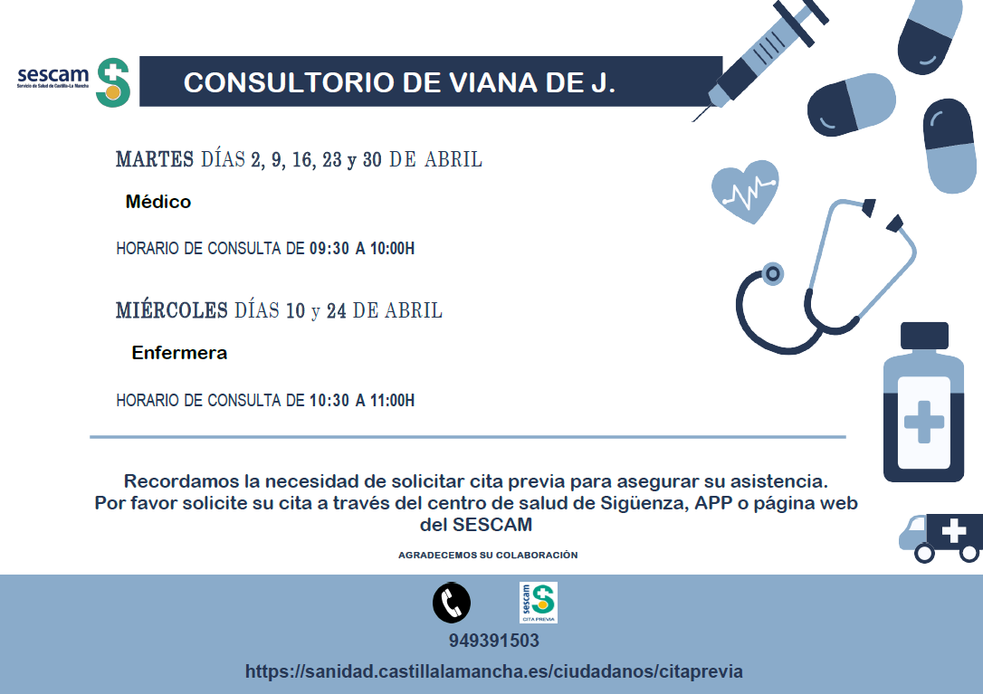 Según nos informan desde el Área Básica de Salud de Sigüenza, las citas en el mes de abril en el Consultorio Local de Viana de Jadraque están previstas los días: