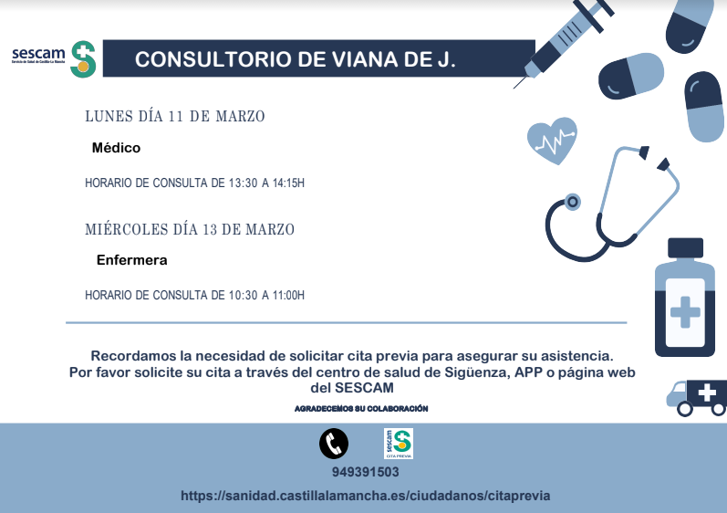 Según nos informan desde el Área Básica de Salud de Sigüenza, las citas en el mes de marzo en el Consultorio Local de Viana de Jadraque están previstas los días: